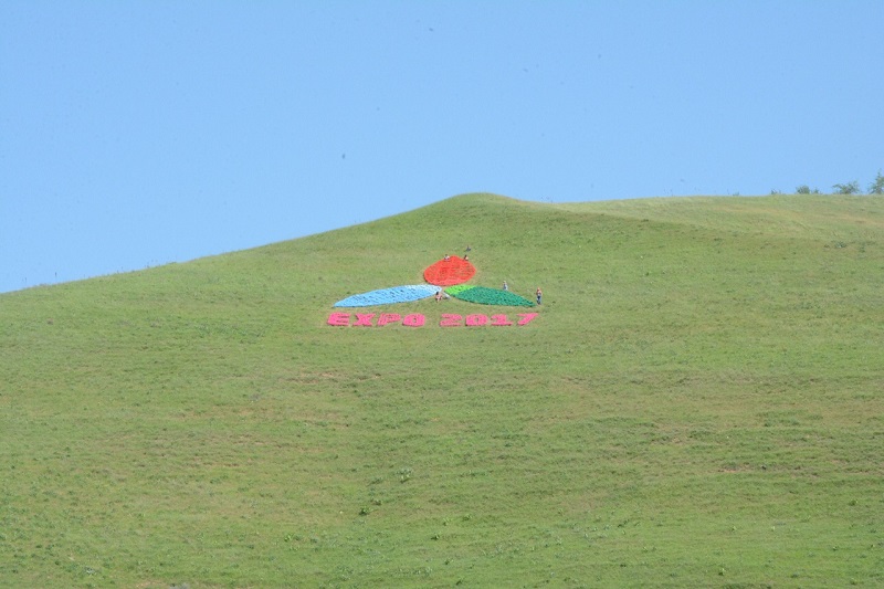 Ár qanaty 10 metrdi quraıtyn logotıp EXPO-2017 halyqaralyq mamandandyrylǵan kórmesin nasıhattaý maqsatynda ornatylyp otyr.
