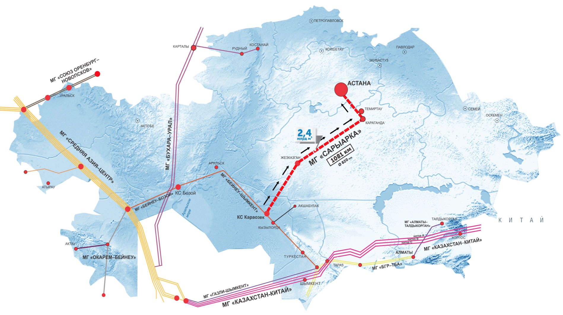 Astanany, Qazaqstannyń ortalyq jáne soltústik aımaqtaryn gazben qamtıtyn «Saryarqa» magıstraldi gaz qubyryn qurý tórt kezeń boıynsha júrgizilmek.Birinshi kezeńde uzyndyǵy 1081 shaqyrymdy quraıtyn Qyzylorda-Jezqazǵan-Qaraǵandy-Astana baǵyty boıynsha magıstraldi gaz qubyrynyń qurylysy josparlanǵan. Ekinshi kezeńde Astana men Kókshetaý aralyǵynda, úshinshi kezeńde Petropavlovskqa deıin gaz qubyryn salý kózdelgen. Sońǵy tórtinshi kezeńde «Jezqazǵan» jáne «Temirtaý» kompressorlyq stansalaryn qurý qarastyrylǵan.