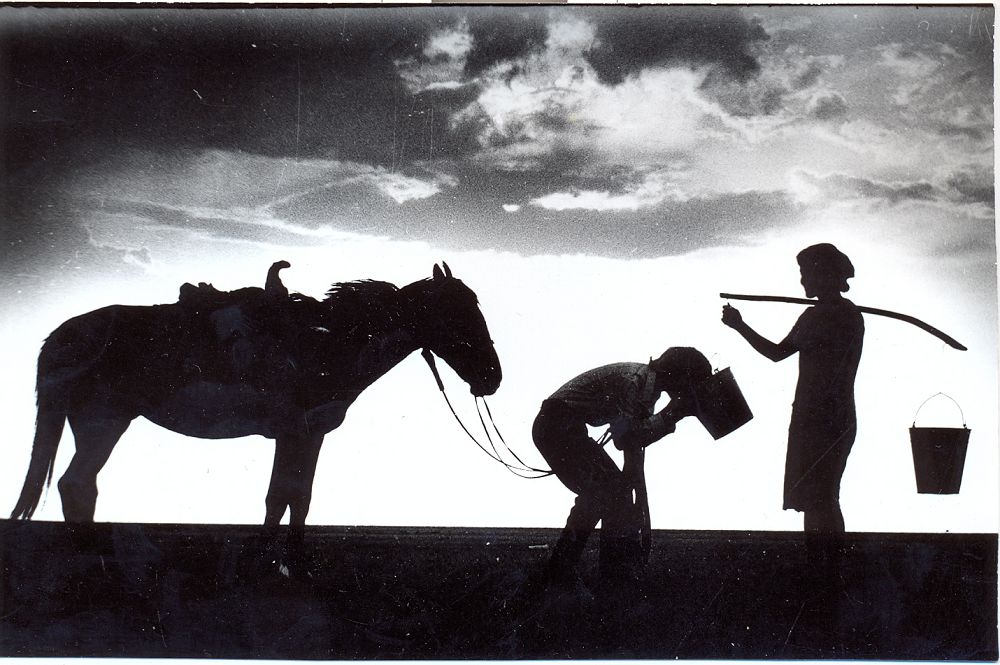 Mahań ekeýmiz toıdan bir kún buryn erterek kelip, bir qoıshynyń úıinde demalyp jatsaq, tań aldynda qoıshynyń qyzy ıinaǵashpen sý alyp kele jatyr eken. Sırek kóriniske tańdana qarap, úıdegi fotokameraǵa qaraı júgirdim. Fotoapparatymdy alyp jetem degenshe, bir attyly jas jigit te atynan túsip qyzdyń sheleginen sý ishe bergende áreń úlgirdim. Sýretti túsirip bolyp artyma qarasam, Mahań syrtymyzdan baqylap tur eken. Eki kózinde jas. Osy kóriniske qatty tolqyǵan-aý, shamasy, meni bas salyp qushaqtap aldy, deıdi óz isiniń has sheberi.