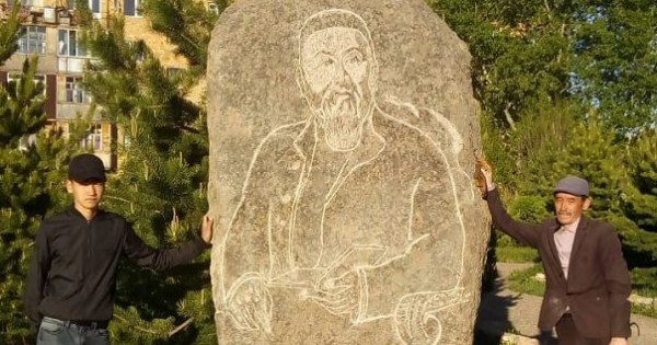 Sýrette: tabıǵı tasqa qashalǵan Abaı beınesi jáne avtorlar.