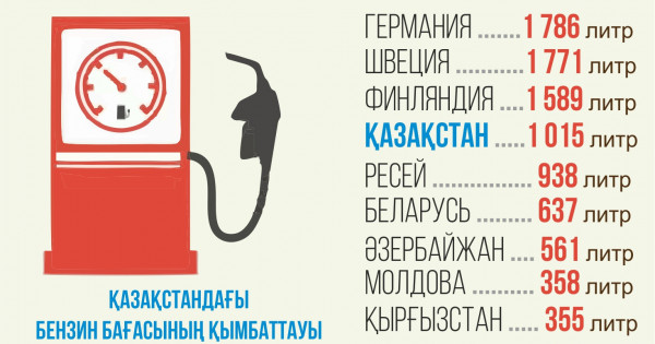 Biraq benzın ındeksi boıynsha, ıaǵnı jalaqyńyzǵa satyp ala alatyn benzın kólemi boıynsha Qazaqstan birneshe elge jol beredi. Orta eseppen ár qazaqstandyq ortasha aılyq jalaqyǵa (salyqty eseptemegende) 1 015 lıtr janarmaı satyp alady. Reıtıngtiń kósh basynda Germanııa (1 786 lıtr), odan keıin Shvesııa (1 771 lıtr) men Fınlıandııa (1 589 lıtr) elderi tur. Kórshiles elderge kóz júgirter bolsaq, ortasha jalaqyǵa Reseı – 938, Belarýs – 637, Ázerbaıjan – 561, Moldova – 358, Qyrǵyzstan – 355, О́zbekstan – 317, Armenııa – 309, Tájikstan azamattary 167 lıtr satyp alady eken.