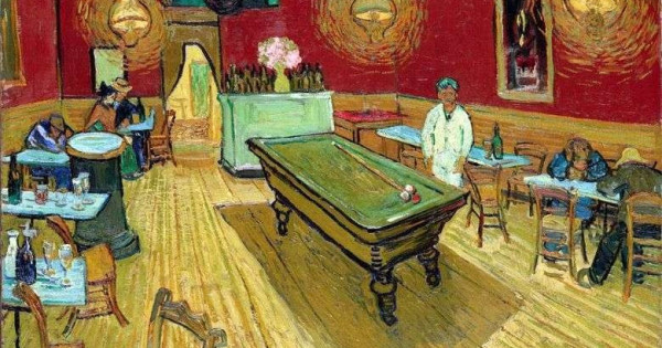 Aldyndaǵy sharabyn taýysa almaı uıqyǵa ketken maskúnem men ishimdikke sylqııa toıǵan eki suhbattasýshy jaǵymsyz áserdi odan ári kúsheıtedi. Bul effektini sary kostıýmdegi kelýshi aıaqtaıdy, ol sýretshi men oqyrmanǵa týra qarap tur. Ol maǵynasyzdyqty Van Gogtan izdeıtindeı.