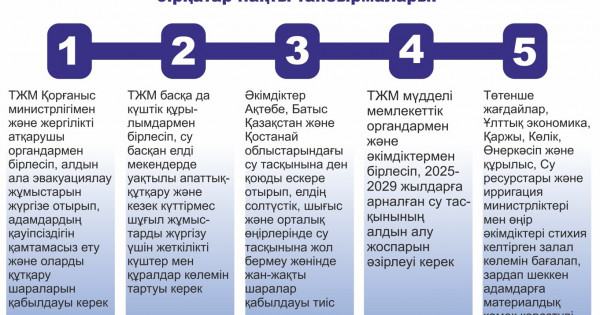 TJM Qorǵanys mınıstrligimen jáne jergilikti atqarýshy organdarmen birlesip, aldyn ala evakýasııalaý jumystaryn júrgize otyryp, adamdardyń qaýipsizdigin qamtamasyz etý jáne olardy qutqarý jóninde qajetti sharalardy qabyldaýy kerek; TJM basqa da kúshtik qurylymdarmen birlesip, sý basqan eldi mekenderde ýaqtyly apattyq-qutqarý jáne kezek kúttirmes shuǵyl jumystardy júrgizý úshin jetkilikti kúshter men quraldar kólemin tartýy kerek; Ákimdikter Aqtóbe, Batys Qazaqstan jáne Qostanaı oblystaryndaǵy sý tasqynyna den qoıýdy eskere otyryp, eldiń soltústik, shyǵys jáne ortalyq óńirlerinde sý tasqynyna jol bermeý jóninde jan-jaqty sharalar qabyldaýǵa tıis; TJM múddeli memlekettik organdarmen jáne ákimdiktermen birlesip, 2025-2029 jyldarǵa arnalǵan sý tasqynynyń aldyn alý josparyn ázirleýi kerek; Tótenshe jaǵdaılar, Ulttyq ekonomıka, Qarjy, Kólik, О́nerkásip jáne qurylys, Sý resýrstary jáne ırrıgasııa mınıstrlikteri men óńir ákimdikteri stıhııa keltirgen zalal kólemin baǵalap, zardap shekken adamdarǵa materıaldyq kómek kórsetýdi dereý bastaýǵa tıis.