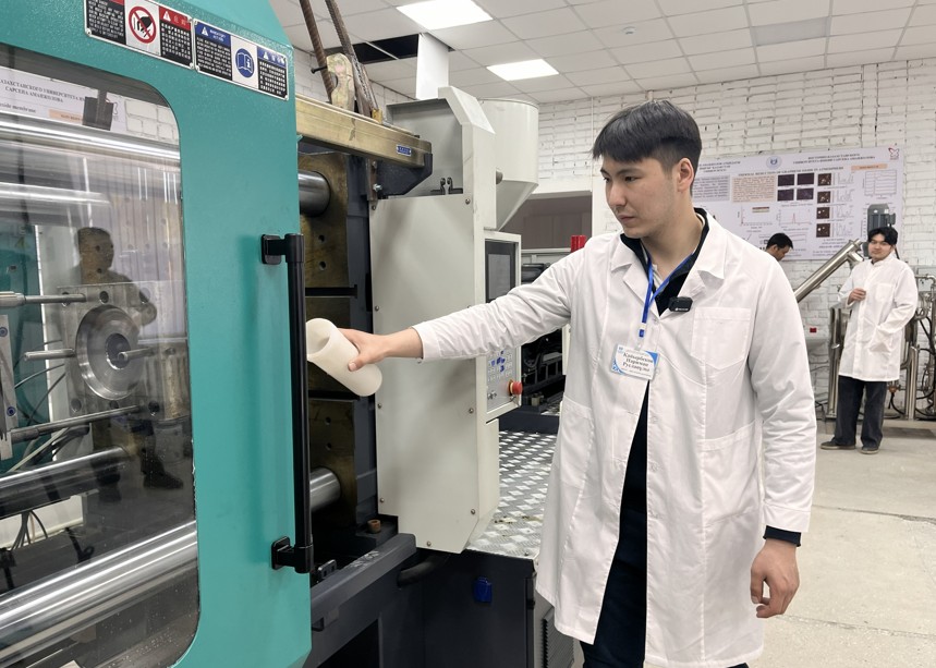 Qaltarystaǵy eńseli bólmege kirip barǵanymyzda, ortadaǵy stanok tynymsyz jumys istep turǵan-dy. Astynan appaq plastmassa staqandar topyrlap túsip jatty. Eki mınýtta bireýin shyǵarady eken. Zerthanashylardyń biri anaý basynan qaptaǵy túıirshikterdi belgili mólsherde salyp otyrady. Alyp apparattyń ishinde qandaı úderis júrip jatqanyn boljaý qıyn emes. Bilýimizshe, túıirshikterdi stanoktyń bir bóliginde eritip, ekinshi bóliginde qalypqa soǵady da, staqan etip shyǵara beredi. Suranysqa qaraı kez kelgen qalypty qoıyp, basqa da dúnıeler shyǵarýǵa bolatyn sekildi. Mundaǵy ǵalymdar sý súzgilerin bastan-aıaq ózderi óndiredi. Eń qyzyǵy, staqan ishindegi súzgiler taza tabıǵı materıaldan jasalady.