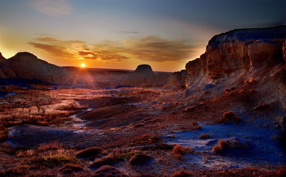Birte-birte baıqadyq, Qı­yn­­­kerish keremeti munymen bit­­peıdi eken. Tabıǵat salǵan jo­­­ǵarydaǵy sýretter biz kór­gen ǵajaıyptardyń basy ǵa­na sııa­qty. Olaı deıtinimiz, tań­da­nys týdyratyn kelesi bir nárse, ol bul óńirdiń kún batardaǵy esh­bir jerde joq qaıtalanbas kó­rinisi der edik. Ony biz myna jaǵ­daıdan baıqadyq. Kún kó­k­jı­ekke qaraı eńkeıgende onyń altyn shapaq sáýleleri qyzyl, sary, aq tasty tóbelerdi jalt-ju­lt etken ushqyndarmen orady da tastady. Osynyń áserinen biz baqylap turǵan oıpat pen bet­keıdegi qumdy kerish to­py­raq­tar qyzylkúreń túske en­di de aldymyzdaǵy adyrlar alaý­la­ǵan otty álemge aınaldy da ket­ti. Jalyndap turǵan bul jer­ge keshqurym ýaqytta aspannan juldyzdar jaýyp, kókke qaı­ta ushyp bara jatqandaı da áser qaldyrady. Bir sózben aı­tqanda, mundaǵy jer de, tó­ńi­rek pen keńistik te josaǵa boıa­lǵan­daı qyzylqońyr bolyp tur­dy da qoıdy. Osy kórinisinde ol Mars planetasy, ondaǵy so­ǵan ǵana tán ǵalamsharlyq qy­zy­lkúlgin relef fonynan esh aýmaıdy-aý, aýmaıdy! Toqete­rin aıtqanda, fantastıkalyq qu­bylysqa bólenip turǵan bul jer­­di aralaı bastaǵan sátte óziń­di beınebir basqa álemge ki­rip ketkendeı sezinetiniń anyq. Ne­me­se tús kórip, ertegiler elinde júr­gendeı bolasyń.
