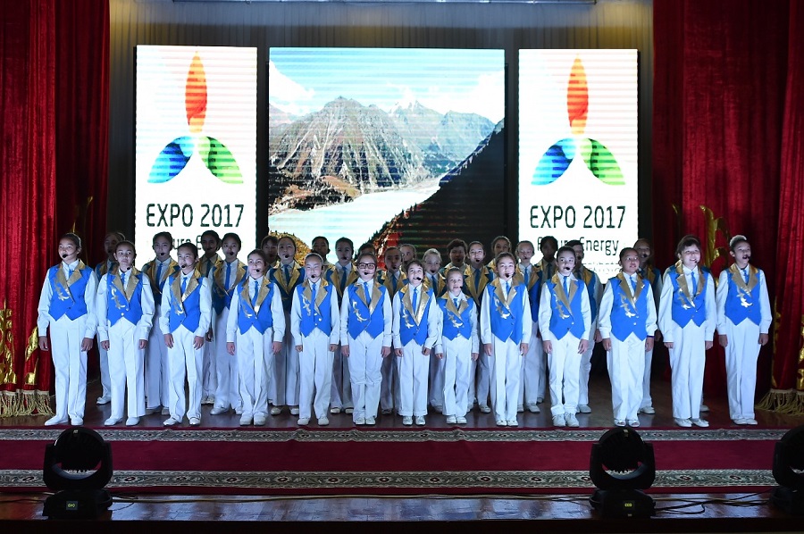 Osydan soń qonaqtar «Bolashaq energııasy» EKSPO-2017» taqyrybynda oqýshylardyń qatysýymen ótken fleshmobty, «EKSPO-2017 halyqaralyq kórmesi – balalar áleminde» atty sahnalyq kórinisti tamashalady.