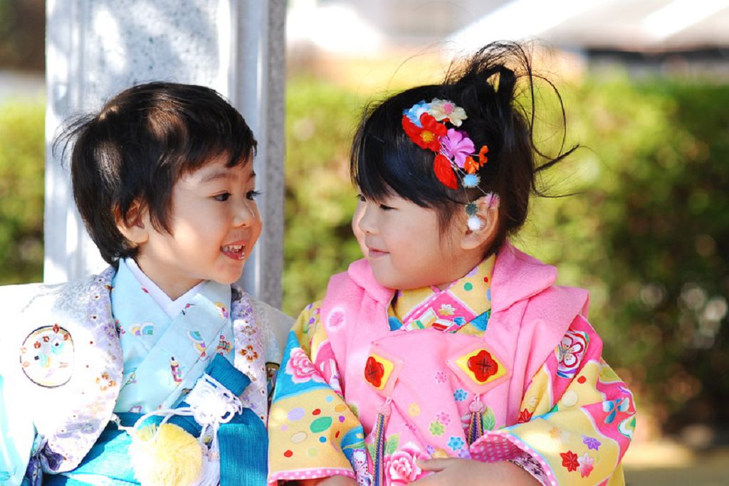 Kúnshyǵys elinde qyz bala jetige kelgende arnaıy tigilgen kımono kıedi de, beli tuńǵysh ret obımen (kımononyń jalpaq beldigi) tańylady. Balalarǵa arnalǵan dástúrli ǵuryptyq sharalardyń qatarynda naýryzdyń úshi kúnine belgilengen qyz balalarǵa arnalǵan hınamasýrı men mamyrdyń besindegi er balalar merekesi bar.