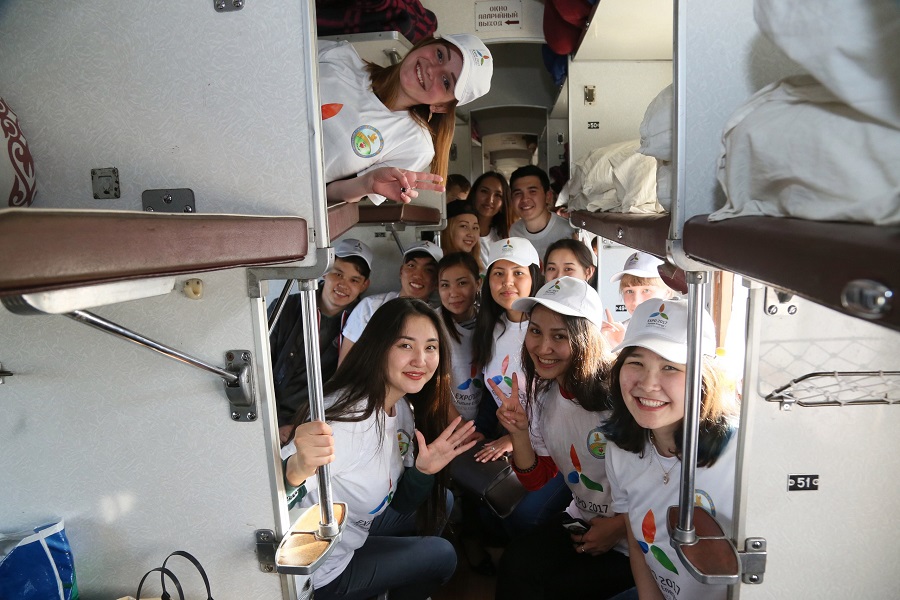 Jastar eki vagonǵa ornalasty. Oblystan bir myń bes júzdeı jas volonter bolǵysy kelip, ótinish bergen edi. Biraq kórmeni uıymdastyrýshylar tarapynan Qostanaı oblysynan 100 adamǵa ǵana suranys túskendikten, jastardy qatań irikteýge týra kelgen.