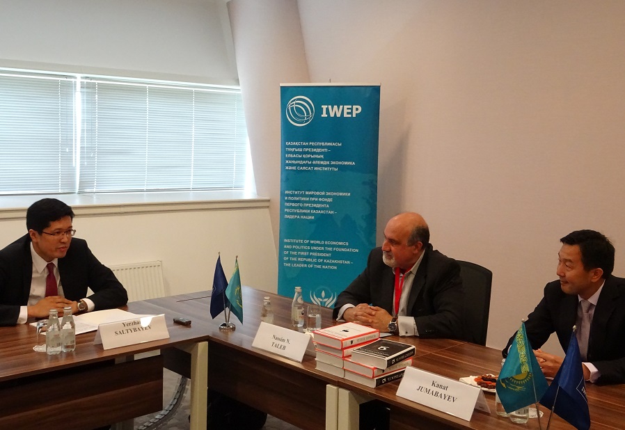 Kezdesý sońynda ÁESI dırektory Erjan Saltybaev Nassım Talebti jalpy álem men Eýrazııa aımaqtary áser etetin jahandyq tendensııalar men  olardy sheshý joldaryn qarastyrýǵa arnalǵan Astana klýbynyń kezekti otyrysyna qatysýǵa shaqyrdy.