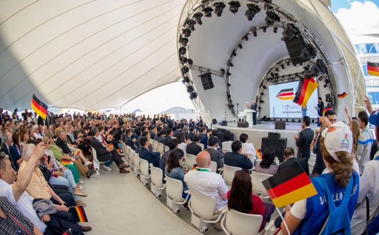 Basqosýdyń resmı bóliminde elimizdiń Investısııalar jáne damý mınıstri Jeńis Qasymbek Germanııa ókilderin ulttyq kúnimen quttyqtap, jyly lebizin jetkizdi. Sodan keıin EKSPO kórmesiniń osy kúniniń basty qonaǵy Germanııa prezıdenti Frank-Valter Shtaınmaıer sóz sóıledi. Ol halyqaralyq shara ǵımarattarynyń fýtýrıstik baǵytta salynǵanyn aıtyp, bul Qazaqstannyń bolashaqqa degen joǵary umtylysyn bildiretinin áńgimeledi. Sondaı-aq, Germanııa kórme barysynda «jasyl» tehnologııalar salasyndaǵy tájirıbesimen bólisetinin atap ótti. «Elimizde búkil elektr energııa kóleminiń úshten biri jańǵyrtylatyn qýat kózderinen óndiriledi. Bizdiń tehnologııalyq tájirıbemiz mol. Bul bizdiń jetistigimiz jáne ony EKSPO kórmesinde barshaǵa kórsetkimiz keledi», dedi Frank-Valter Shtaınmaıer.