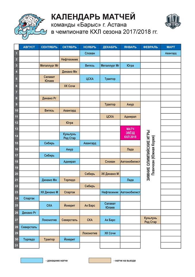 «Barys» jańa maýsymnyń alǵashqy oıyndaryn óz aıdynynda ótkizedi. Áýeli elordalyqtar 24 tamyzda «Spartak» klýbymen kúsh synassa, ekinshi oıynda 26 tamyzda rıgalyq «Dınamomen» sheberlik baıqasady. 28 tamyzda Astanaǵa qonaqqa «Severstal» keledi. «Barys» úıdegi sońǵy oıynynda 30 tamyz kúni «Torpedoǵa» qarsy aıdynǵa shyǵady.