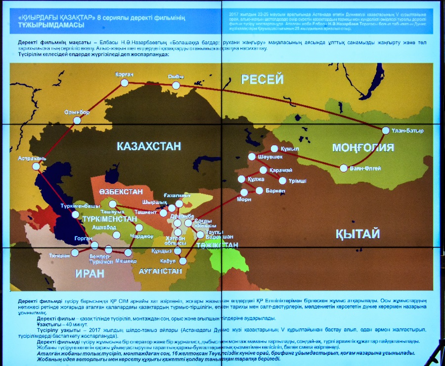 Jobany iske asyratyn qurylym – «Qazkontent» AQ-na qarasty «Qazaqstan tarıhy» ınternet ujymy. Joba jetekshisi Oljas Berkinbaevtyń tanystyrǵan josparyna qaraǵanda, fılmniń ár serııasy 40 mınýttan turady. Ulaspaly týyndyda – áýeli, sheteldegi qazaqtardyń tarıhy, ómiri, etno turmysy men mádenıetin tolyq qamtý kózdelip otyr. Fılm qazaq tilinde jasalyp, tolyq montajdalǵan soń orys, aǵylshyn tilderine aýdarylady. Jumys barysynda qazaqtar ómir súrip jatqan eldiń arhıvtik qujattarymen de tanysyp, ony fılm barysynda paıdalaný, ári shettegi tanymal qaıratker tulǵalar jaıly jeke-jeke sıýjetter daıyndaý isi qolǵa alynbaq. Jumys barysynda keıbir mańyzdy sıýjetterdi ınternet arqyly tikeleı halyqqa joldap otyrý jaıy da qarastyrylǵan. Bul týyndy alda kele jatqan Táýelsizdik merekesine deıin tolyq aıaqtalady dep kútilýde.