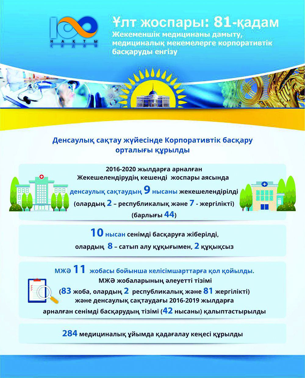 «100 naqty qadam» Ult josparynyń 81-qadamynda «áleýmettik medısınalyq saqtandyrý jaǵdaıyndaǵy bastapqy medısınalyq áleýmettik kómekti qarjylandyrý – báseke esebinen medısınalyq uıymdardyń korporatıvtik basqarý qaǵıdattaryna kóshýin qamtamasyz etetini» aıtylyp, memlekettik medısınalyq uıymdardy jekeshelendirýdi yntalandyrý, memlekettik emes uıymdar arqyly tegin medısınalyq kómektiń kepildendirilgen kólemin berýdi keńeıtý qajettigi atap kórsetilgen.