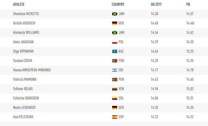 Aıtpaqshy, fınalda baq synaıtyn 12 qyzdyń tizimi – tómendegideı. Úshinshi baǵanda árqaısynyń 2017 jylǵy eń úzdik kórsetkishteri, al sońǵy baǵanda jeke rekordtary túzilgen: