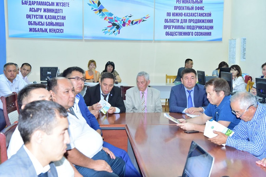О́ńirdegi atqarylǵan jumystarǵa qanyqqan L.Gýmılev atyndaǵy Eýrazııa Ulttyq ýnıversıeti rektorynyń áleýmettik-mádenı damý jónindegi prorektory Dıhan Qamzabekuly Elbasynyń «Rýhanı jańǵyrý» baǵdarlamasynyń mańyzdylyǵy jaıynda sóz qozǵady. Ol sondaı-aq, respýblıka kóleminde qolǵa alynǵan jobalyq menedjment jumysy boıynsha Ońtústik Qazaqstan oblysyndaǵy qoǵamdyq sanany jańǵyrtý jobalyq keńsesi tarapynan júzege asyrylyp jatqan jumystarǵa oń baǵasyn berdi.