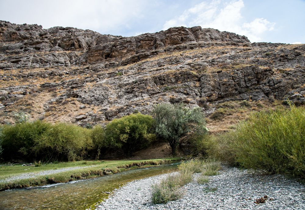 Osy tektes áńgimelerge qulaǵymyzdy sýaryp otyryp ataqty Qatynqamal úńgirine jetkenimizdi de baıqamaı qalyppyz. Úńgirdiń dál aldynan kóterilýge bolady. Biraq aldynda sarqyrap Aqúıik ózeni aǵyp jatyr. Kúzdiń kúni sýyq sýdy keship júrýge asa zaýqymyz soqpady. Bir búıirindegi taýdan asyp túsetin jalǵyz aıaq jol bar eken. Sol arqyly Qatynqamalǵa barýǵa bekindik.