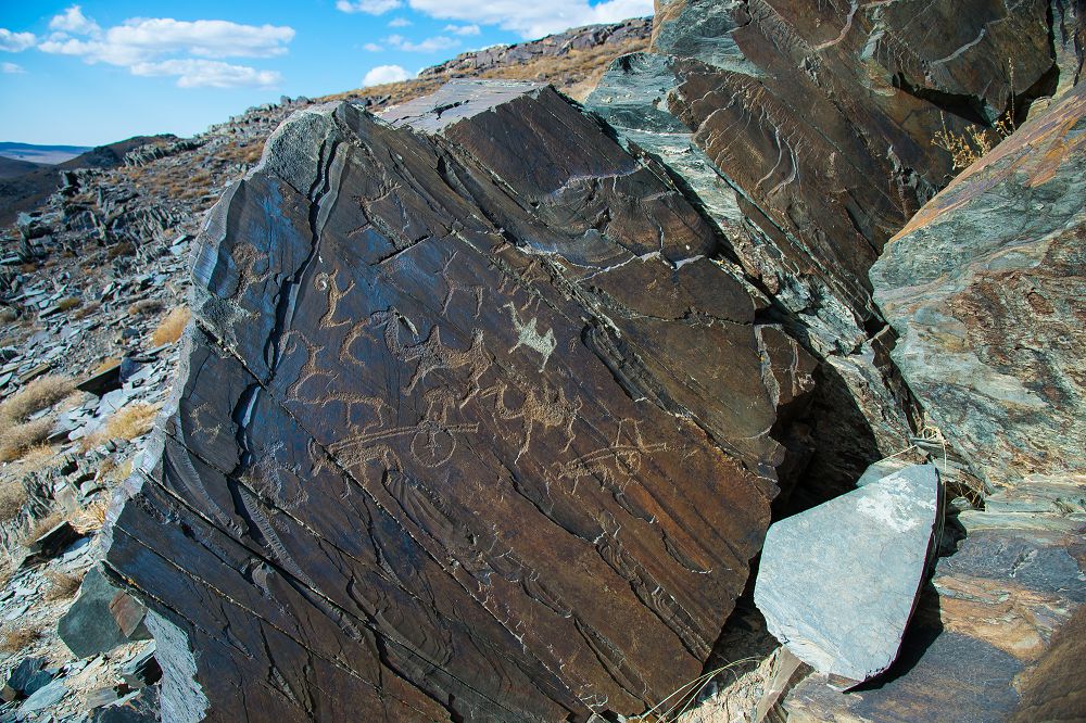 Mynaý Shuqyroı. Odan keıin Qosúıeńki. Qosúıeńkiniń sol qaptalynda Taqııatóbe jatyr. Darbazadan ótip, taýǵa kirdik. Baǵytymyz – Saýysqandyq. Sóz basynda aıttyq, Saýysqandyqtyń qoınaýy qazyna. Mádenı qazyna. Oılańyzshy, bizdiń zamanymyzǵa deıingi ekinshi myńjyldyqta, tas jáne qola dáýiriniń basynda ómir súrgen adamdardyń qoltańbasy qalǵan ǵoı. Bala Saýysqandyq ózenin boılap kelemiz. Kóneniń kózindeı bolǵan tastaǵy tańbalardyń izi baıqalady. Taýǵa órmelep shyqtyq. Qudaı-aý, tas dáýiriniń tamashasy kóz aldymyzda jarq ete qaldy. Mine, ógizge arba baılap, ony adam aıdap ketip barady. Altybaqan sekildi dúnıede eki adam terbelip turǵandaı. Arqar oınap, túıe mań-mań basyp, taýeshki tastan-tasqa sekirip bara jatqandaı. Bir tusynda atqa qonǵan, qolyna qylyshyn alǵan sarbazdy kóresiz. Tap bir kıno lenta dersiz. Keremet kórinis. Endigi sózimizdi ǵalymdardyń dálel-deregimen jalǵaıyq.