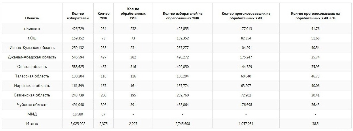 Saǵat 17:00- de belgili bolǵan málimetterge súıenip, «Taza Esep» Úılestirý Ortalyǵy Qyrǵyzstandaǵy saılaýshylardyń 37,39 paıyzy daýys berdi dep habarlady.