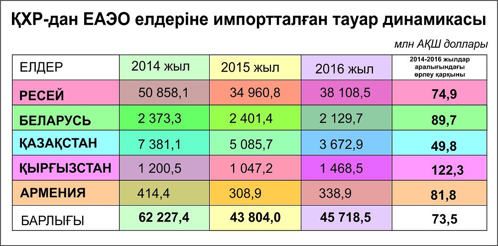 Rasynda da bizdiń el bul tarapta zor zııan shegip keledi. Muny Eýrazııalyq ekonomıkalyq komıssııanyń málimetteri de rastaıdy. Mysaly, EAEO elderiniń ımporty 2016 jyly 201,1 mlrd AQSh dollaryn quraǵan. Bul rette ımporttyń basym bóligi QHR-ǵa (22,7%) tıesili. 2017 jyldyń 7 aıynyń qorytyndysy da osy kórsetkishke uqsas. 2014-2016 jyldar boıynsha Qytaı Halyq Respýblıkasynan EAEO elderine taýardy ımporttaý dınamıkasy Qyrǵyzstandy qospaǵanda barlyq elderde tómendegen.
