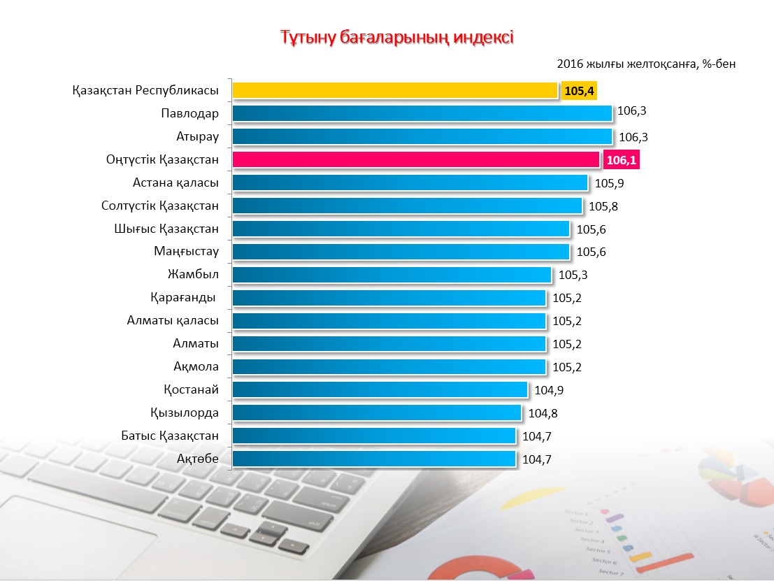 Budan bólek, oblysta azyq-túlik taýarlarynyń baǵalary men tarıfteri 4,3 paıyzǵa, al azyq-túlik emes taýarlar 8,6 paıyzǵa ósken. Halyqqa kórsetiletin aqyly qyzmetter 5,8 paıyzǵa qymbattaǵan.