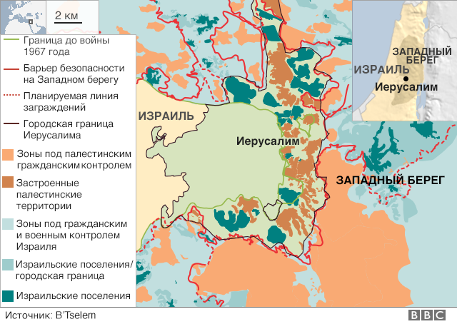 1967 jyldan beri Izraıl Shyǵys Ierýsalımde ondaǵan shaǵyn aýdan salyp, búginde onda shamamen 200 myń ızraıldik turyp jatyr. Halyqaralyq quqyq normalaryna sáıkes, ızraıldikterdiń ol jerlerde úı salyp, ornyǵýy zańsyz. Alaıda Izraıl munymen kelispeıdi. BBC-diń jazýynsha, AQSh-tyń Ierýsalımdi Izraıl astanasy retinde moıyndaýy halyqaralyq qaýymdastyqta shıelenis týdyryp, Izraıldiń shyǵys Ierýsalımdegi qonysty zańdastyrý boıynsha ustanymyn kúsheıtpek.