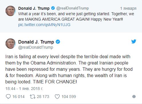 Odan keıin AQSh Prezıdenti "jaqsy adamdar ózgeristiń bolǵanyn qalaıdy", dep jazdy. Al sherýge shyqqan halyqqa qarsy áreketter bastalǵanda Tramp «Irandaǵy iri kóterilister. Jurt aqyry oılandy-aý. Olardyń baılyǵy, aqshasy urlanyp, terrorızmge jumsalyp jatyr. Halyq endi oǵan tózbeıtin sekildi. AQSh adam quqyǵyn buzýshylardy nazarda ustap otyrady», dep jazdy Twitter jelisindegi paraqshasynda. Al oǵan jaýap retinde Hasan Rýhanı AQSh prezıdentin «Irannyń jaýy» degen málimdeme jasady.