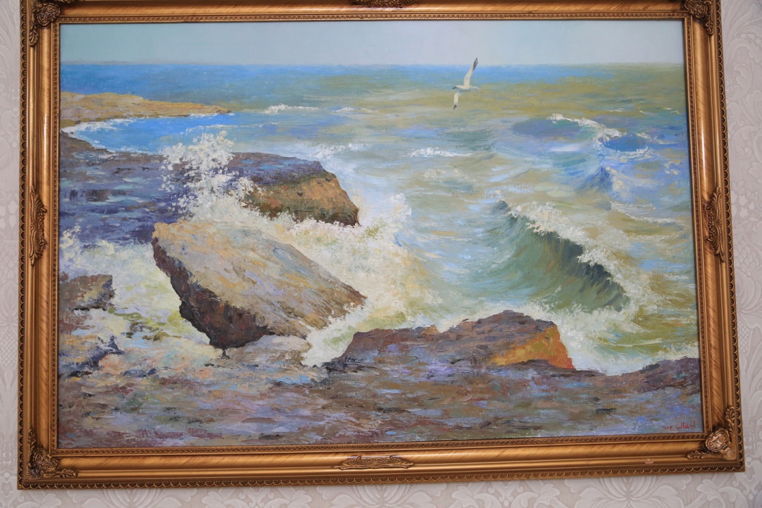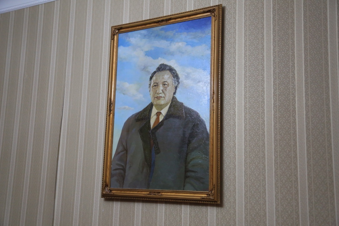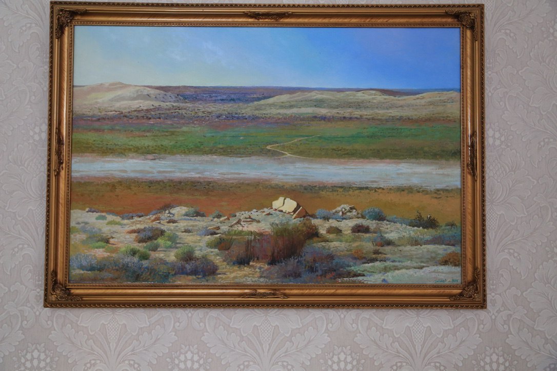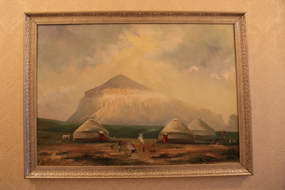 Úıdiń qabyrǵalaryna maıly boıaýmen salynǵan kartınalar ilinipti. Sonaý 1978 jyly nemister álemniń úzdik júz jazýshysyn anyqtaǵan. Solardyń jıyntyq sýreti de úlken bolyp ilinip, sán berip tur. Arasynda úsh musylman bar. Rasýl Ǵamzatov, Shyńǵys Aıtmatov, Ábish Kekilbaıuly. Endi bir kartına – Sherqala. «Uıqydan oıanǵan arý» eńbeginde jazýshy: «Tús kezinde Aqmysh bulaǵynyń qarsy aldyndaǵy aınalasy bir shaqyrymdaı qum tastan turatyn jan-jaǵy ushpa quz Sherqala shyńyn baryp kórdik. Onyń basyna shyǵý úshin ádeıi baspaldaq jol jasalypty. Eteginde tas qamaldyń jurnaǵy jatyr. Basynda el turǵan qonys, shamasy qudyq bolsa kerek, bir túpsiz shuqyr bar. Syńaıyna qaraǵanda, jer asty pana sııaqty bor keýekten salmaǵy 17 fýnt bolatyndaı saýyt taýyp aldyq. О́ne boıyn tot basyp ketipti, batyr jaýyngerdiń saýytyna uqsaıdy, kóp jerin oq tesip tastapty. Oq tıgen jerge qatqan qannan turǵan tottyń izin qansha tazartsaq ta ketire almadyq. Sherqala shyńynyń bıiktigi 90 sajyndaı. Onyń qasyndaǵy kóne qamal ornynan uzyndyǵy 6 vershok, qalyńdyǵy bir vershok tórt buryshty jaqsylap kúıdirgen qysh kirpishter taýyp aldyq. Onyń bir synyǵyn Novopetrovsk bekinisine ákelip, qamal salyp jatqan ınjener kapıtan Gennerıhqa kórsetip edik, jaqsy kirpish dep maqtady. Shamasy sol mańnan tabylǵan tas kómirdiń tabyna kúıdirilse kerek». Bul M.I.Ivanınniń «Orys geografııa qoǵamy jazbalarynyń» 1847 jyly shyqqan 11 kitabynda jarııalanǵan «1846 jyly Mańǵystaý túbegine barǵan saparym» deıtin uzaq jol jazbalarynan alynǵan úzindi» dep mysal keltiripti.