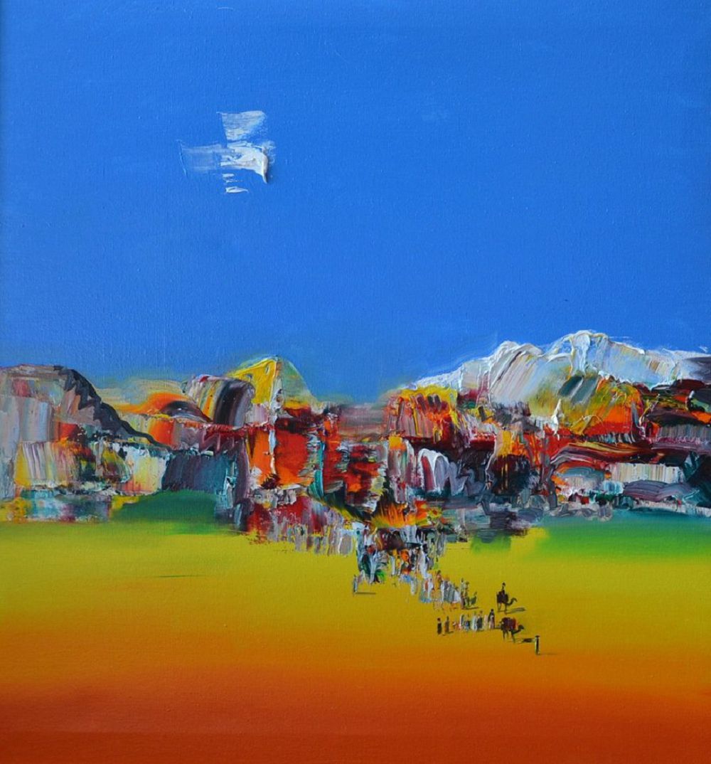 Osy ýaqytqa deıin 7000-nan artyq kartına salyp, ómirden ótken, kózi tiri belgili sýretshilerdiń týyndylaryn satyp alyp, olarǵa ǵumyr syılaǵan Alpysbaı Qazyǵulov qazaq beıneleý óneriniń negizin qalamasa da, oǵan abstraksıonızm negizin qalaǵandardyń biri dep batyl baǵa berýge bolady. Art-galereıada onyń osy baǵyttaǵy on bes kartınasy qoıylǵan. «Kósh», «Qalyńdyqtyń uzatylýy» atty kartınalary arhaızmge aınalǵan baıyrǵy tanymnan týǵan dúnıeler bolsa da, erekshe mádenıettiń ıesi bolǵan babalarymyzdyń turmys-saltyn jańasha jazýymen, qalyptan tys qııaldaǵy qısynmen qaz-qalpynda kóz aldymyzǵa ákeledi. Avtor aıtar oıyn amalsyz tórtburyshty jıektemege qamap qoıǵany bolmasa, sary dalaǵa degen saǵynyshy shetsiz-sheksiz keńistiktiń ózimen astasyp ketken. Al «Qalyńdyqtyń uzatylýynda» qulaǵyńa syńsý kelgendeı bolady, ıakı qara óleńniń shýmaqtary boıjetkenniń nazyn jetkizedi. Abstraksııanyń «adam túsinbeıtin baǵyt» emes ekenin, ózgelerdeı myń túrli ádiske salyp, eles sekildi, esti shyǵaratyn tańqy-taran kúıge túsirmeı, qazaqy uǵymmen beıneleýi arqyly elimshil erek minezin baıqatady.