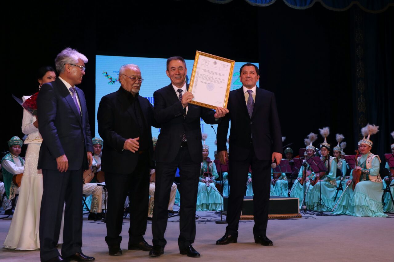 Jańa mártebeni berý týraly resmı qujatty oblys ákimi Nurlan Noǵaev pen teatr basshysy Berek Djamenovke mınıstr Arystanbek Muhamedıuly jáne Alashtyń abyzy atanǵan KSRO Halyq ártisi, Memlekettik syılyqtyń ıegeri, Qazaqstannyń Eńbek eri Asanáli Áshimov saltanatty túrde usyndy.