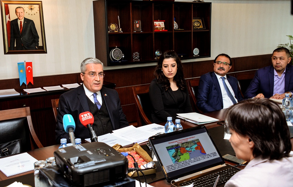 Dıplomat Sırııa daǵdarysy bastalǵannan beri Túrkııanyń ustanymynan aınymaı, elge kómek qolyn sozyp kele jatqanyn atap ótti. Qazirgi tańda eldegi jaǵdaıy retteý úshin Jeneva kelissózderine, Astana prosesine kepil-memleket retinde qatysyp otyrǵanyna da toqtaldy. Sırııadan bosqan 3,5 mıllıon halyq Túrkııada bas saýǵalap júrgenin de sóz etti. Elshiniń aıtýynsha, «Záıtún butaǵy» operasııasy kezinde beıbit turǵyndar men dinı oryndar, mádenı nysandar, tarıhı jáne arheologııalyq eskertkishterge zaqym keltirmeý úshin saqtyq sharalary qarastyrylǵan.