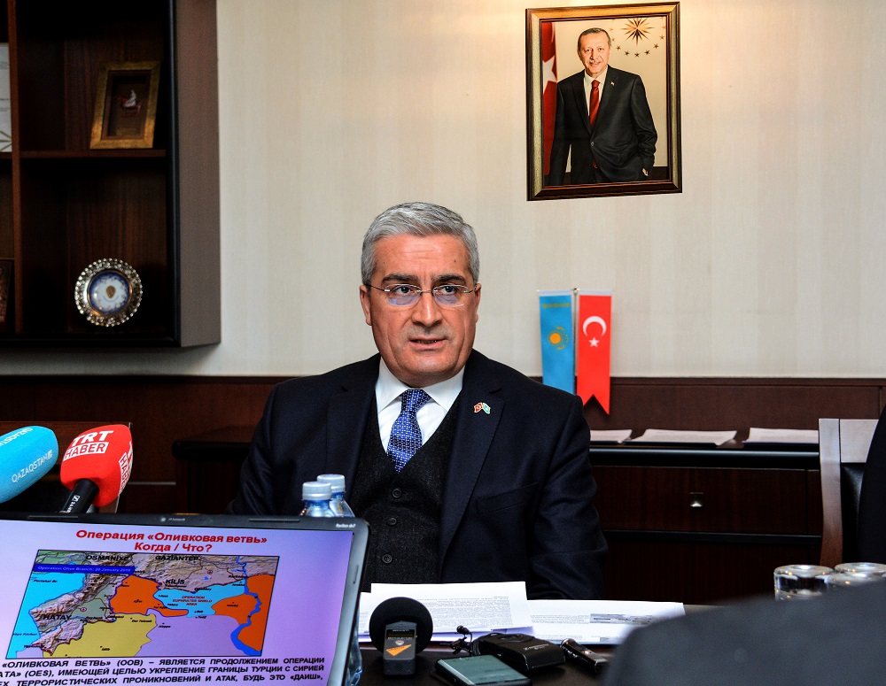 «Operasııa bastalǵannan beri Túrkııa áýe kúshteri terrorıstik uıymdarǵa tıesili 782 nysan joıylǵan. Budan bólek eki myńnan astam lańkestiń kózi qurtyldy. Qaqtyǵys barysynda qarýly kúshterimizdiń 32 sarbazy mert bolyp, 183 jaýyngeri jaralandy. Is-qımyldar kezinde halyqaralyq qoǵamdastyq tyıym salǵan oq-dáriler qoldanylmaıdy. Mundaı qarýlar Túrkııa arsenalynda joq», degen elshi «Záıtún butaǵy» operasııasynyń mańyzyn túsindirdi.