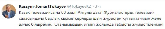 Q.Toqaev tvıtterdegi jeke paraqshasyna: «Qazaq televızııasyna 60 jyl! Aıtýly data! Jýrnalısterdi, televızııa salasyndaǵy barlyq qyzmetkerlerdi shyn júrekten quttyqtaımyn jáne alǵys bildiremin. Otanymyzdyń ıgiligi jolynda tabysty jumys tileımin!» dep jazdy.