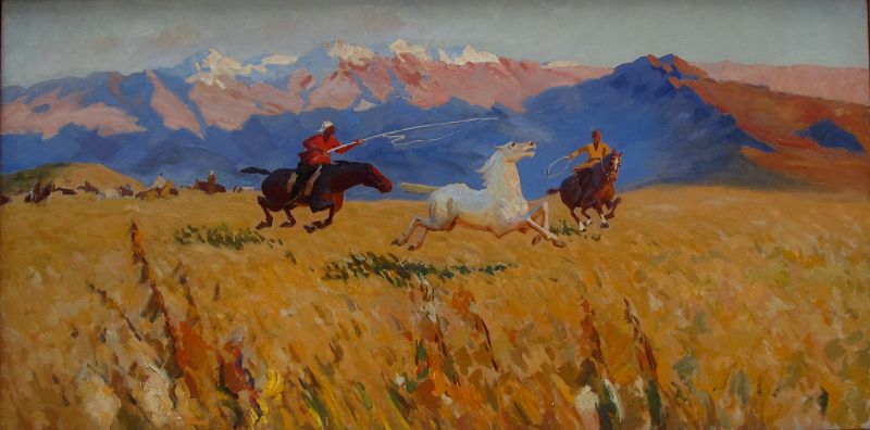Quryq kórmegen shý asaý en dalanyń erkin jortqan erkesindeı elesteıdi. Bas bermek túgili, mańaılatpaıdy. Al ony qýǵan beıtanys ekeý aldarynda atyrynǵan asaýǵa quryq salýǵa umtylady. Shý asaý shirkin, olar túgili ýaqyt jyldamdyǵyna da des bermeıtindeı. Dúnıe dıdaryndaǵy máńgilik qozǵalys tulpardyń tuıaǵymen birge shyr-kóbelek aınalady. Jelden júırik arǵymaqtyń saýyrynda namys qamshysy oınaıdy. Oınaıdy da, jyldamdyq odan saıyn údeı túsedi. Tulpar namys tutas dalany dúbirge bóleıdi. Arǵymaq taǵy da, tuıaǵy jumyr dalanyń júregin julyp alardaı yshqynady. Beıne bir tańǵajaıyp ertegilerdegi aq qanatty sáıgúlikteı keń dalada kósile shaýyp barady. Shashasyna shań juqpaǵan tákappar tulpar ekpininen jel burqap quıyndap aǵady. Qoldarynda uzyn quryq pen arqany bar erjúrek jas jigitter bar ekpinimen shaýyp kele jatqan aqbozatty jan ushyra qýady. Endi birde kese-kóldeneń kelip qaptarlasa zaýlaıdy. Áne, qasqa jırendi tizgindegen adýyndy qara bala qolyndaǵy arqanmen asaýǵa shalma urmaqqa bekinedi. Dál osy jerde sýretshi qııaly sharyqtaý shegine jetip, arpalysqan oılarmen alysady. Kenep betindegi jansyz beıne kóńil kúıdi terbetip san sezimniń sıqyryna jeteleıdi. Sol baıaǵy kókjıek, asqar taýlardyń tizbegimen qorshalǵan tanys dala. Tek mundaǵy peızaj batyp bara jatqan kún sáýlesimen araılanady. Taýlar syzyǵy boıaý túrleriniń úılesimdilik tabýyna oraı anaǵurlym qımyl qozǵalysty, oınaqy bop kórinedi. Sýretshi peızajdy kók, aq, qyzyl, sary boıaýlarmen keskindegen. Munyń ózi kartınaǵa jandy qozǵalys berip tur. Kompozısııadaǵy qıǵash qıyp túsken syzyqtar jeligip alǵan sáıgúlikterdiń shabys yrǵaǵyn ekpindetedi. Aqbozat kartınanyń naq ortasynda beınelengen, sondyqtan eń ashyq tús kórermenniń nazaryn eriksiz aýdarady. Salt attylardyń ústindegi ulttyq kıim, kartınanyń bolmysyndaǵy ulttyq boıaýlardy qalyńdata túskendeı. Qylqalam ıesiniń shyǵarmadaǵy negizgi mıssııasy erlik pen eptilik arqyly halyq batyldyǵyn, ulttyń asqaqtyǵyn kórsetý.