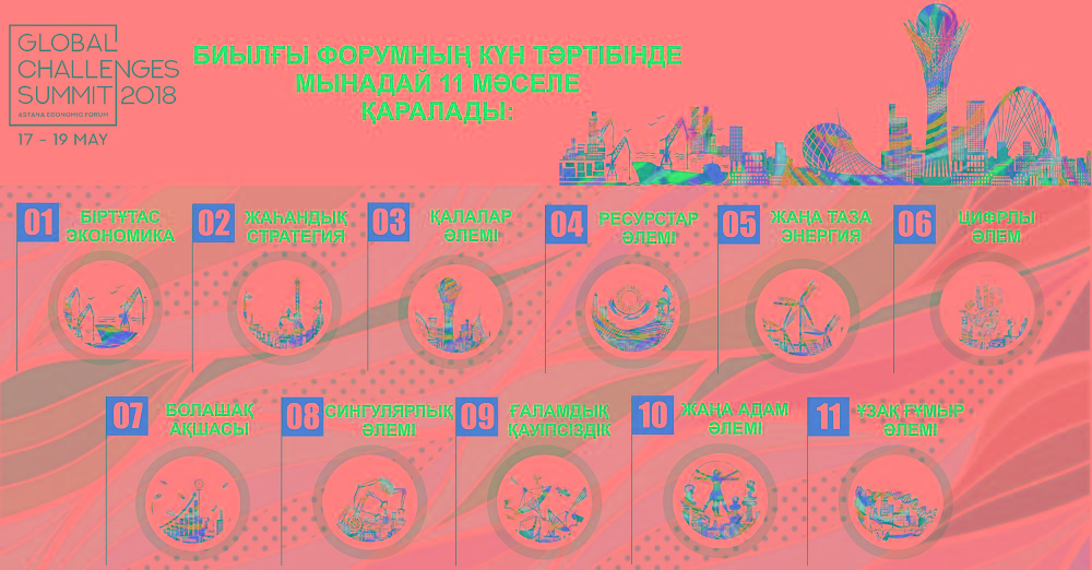 Astana ekonomıkalyq forýmy negizinde Global Challenges Summit-2018 jahandy syn-tegeýrinder sammıti barysynda bolashaqta adamzat ómirin san túrli dertten aman alyp qalýdyń joldaryn qarastyrý basty mindetterdiń biri bolmaq.