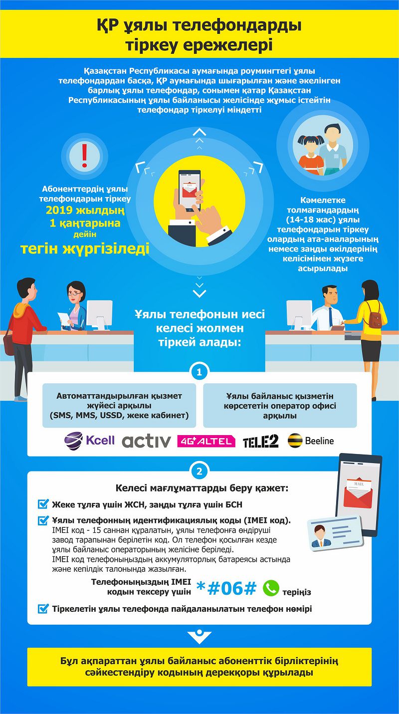 Aıta ketý kerek abonentter uıaly baılanys qurylǵylaryn tirkeý úshin baılanys operatorlarynyń abonenttik bólimderine barmasa da bolady. Olar qurylǵylaryn tirkeýdi onlaın rejiminde nemese SMS arqyly júzege asyra alady.