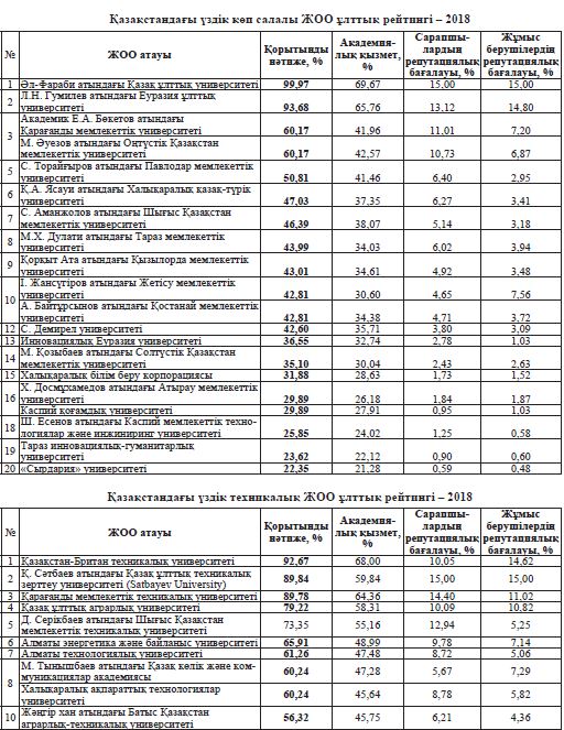Qazaqstannyń úzdik joǵary oqý oryndarynyń Ulttyq reıtıngi – 2018