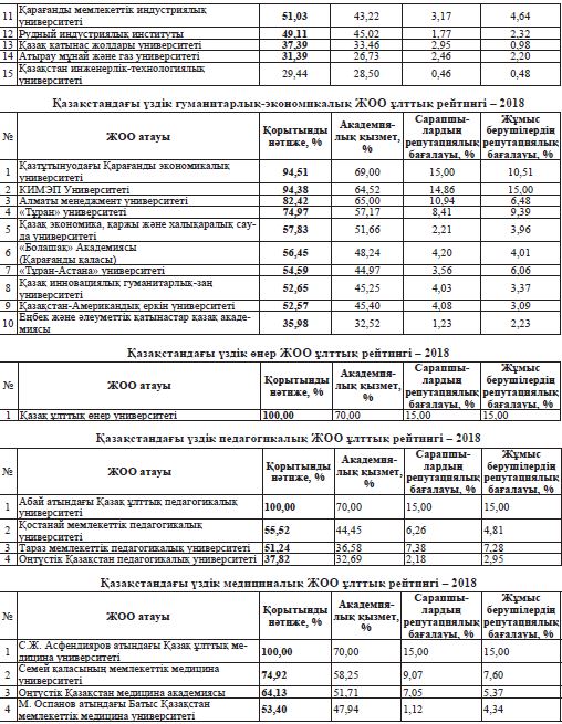 Instıtýsıonaldyq reıtınginiń úsh saýalnama nátıjeleri boıynsha qory­tyn­dy ball joǵary oqý oryndar qyzmeti baǵ­darlamalary boıynsha usynylǵan – kóp­salaly, tehnıkalyq, gýmanıtarlyq-eko­no­mı­ka­lyq, óner, medısınalyq jáne peda­go­gı­ka­lyq ýnıversıtetter.