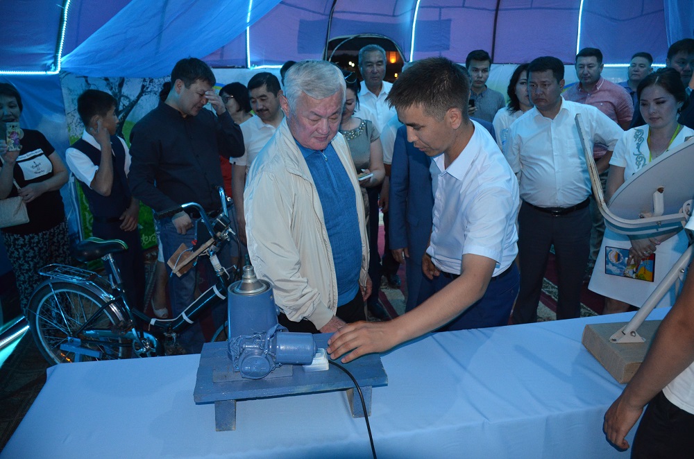 - Zamanaýı úlgide jabdyqtalǵan ári túrli tústermen kómkerilgen IT aǵash úıdiń ishine fızıka páni muǵalimderi men oqýshylardyń birlesep jasaǵan týyndylary qoıyldy. Mundaǵy jergilikti jańashyldardyń qolynan shyqqan kún men jeldiń qýatyn paıdalaný arqyly jumys isteıtin qondyrǵylar men aspaptar eshkimdi enjar qaldyra almaıdy. Sonymen birge ashy sýdy tushytý quraldary da kópshiliktiń qyzyǵýshylyǵyn týǵyzyp otyr, - deıdi Shalqar qalasyndaǵy №7 orta mekteptiń dırektory Gúlsaıran Ybyraeva.