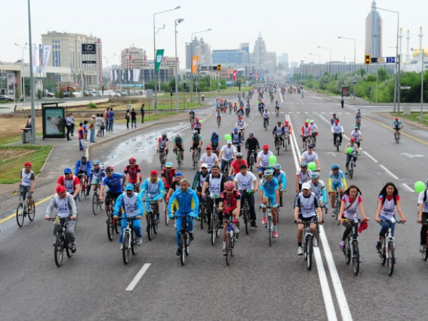 Sport kúnine oraı ótip jatqan sharada qatysýshylar Qabanbaı batyr dańǵylynyń boıymen «Saltanat saraıynan» bastap «Astana Arena» stadıonyna deıin 5 shaqyrym joldy velosıpedpen júrip ótedi.