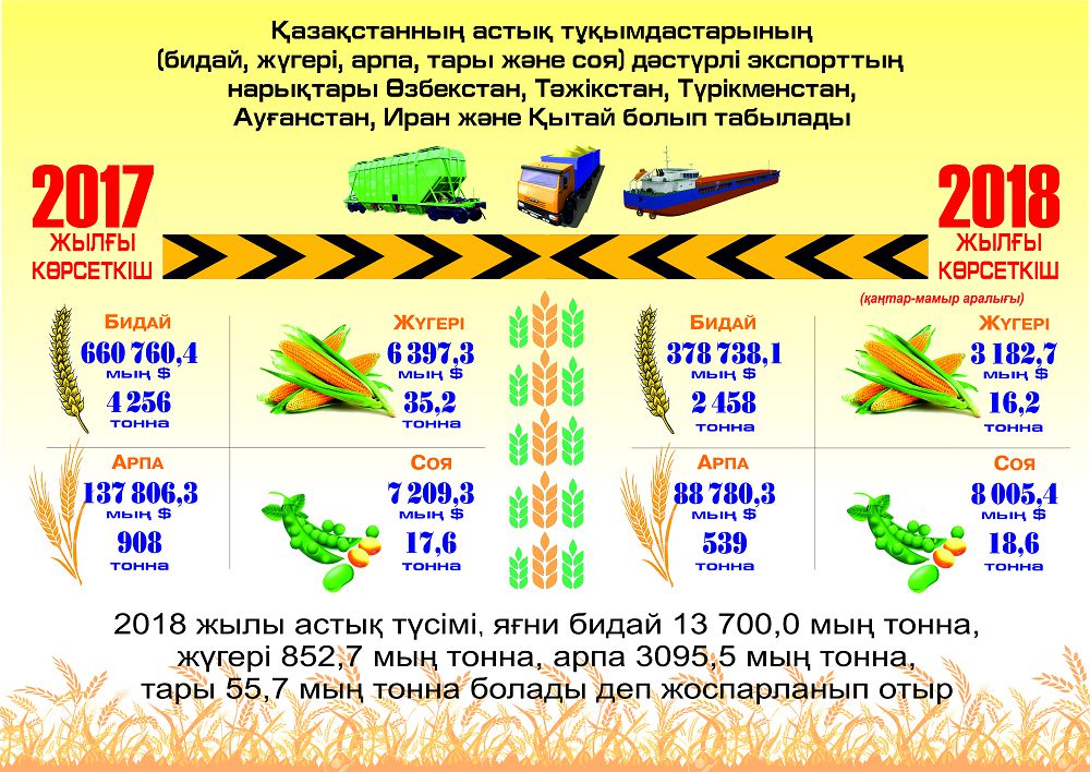 – Qazaqstannyń astyq tuqymdastary (bıdaı, júgeri, arpa, tary jáne soıa) eksportynyń dástúrli naryqtary О́zbekstan, Tájikstan, Túrikmenstan, Aýǵanstan, Iran jáne Qytaı elderinde. 2017 jylǵy kórsetkish boıynsha jalpy somasy 660 760,04 myń AQSh dollaryn quraıtyn 4 256 myń tonna bıdaı eksporttaldy. 6 397,3 myń AQSh dollaryn quraıtyn 35,2 myń tonna júgeri syrtqy naryqqa jóneltildi,– dep habarlady mınıstrliktiń baspasóz qyzmeti.