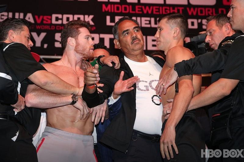 Golovkınniń salmaǵy 159,6 fýntty (72,39 keli), «Kanelo» - 159,4 fýntty (72,3 keli) kórsetti. Salmaq ólsheýden soń boksshylar bir-birin kózben atysty. Munyń sońy jaqsylyqqa soqtyrmady. Olar tóbelesýge shaq shaq qaldy, al komandalastarynyń arasynda da osyndaı jaǵdaı boldy.