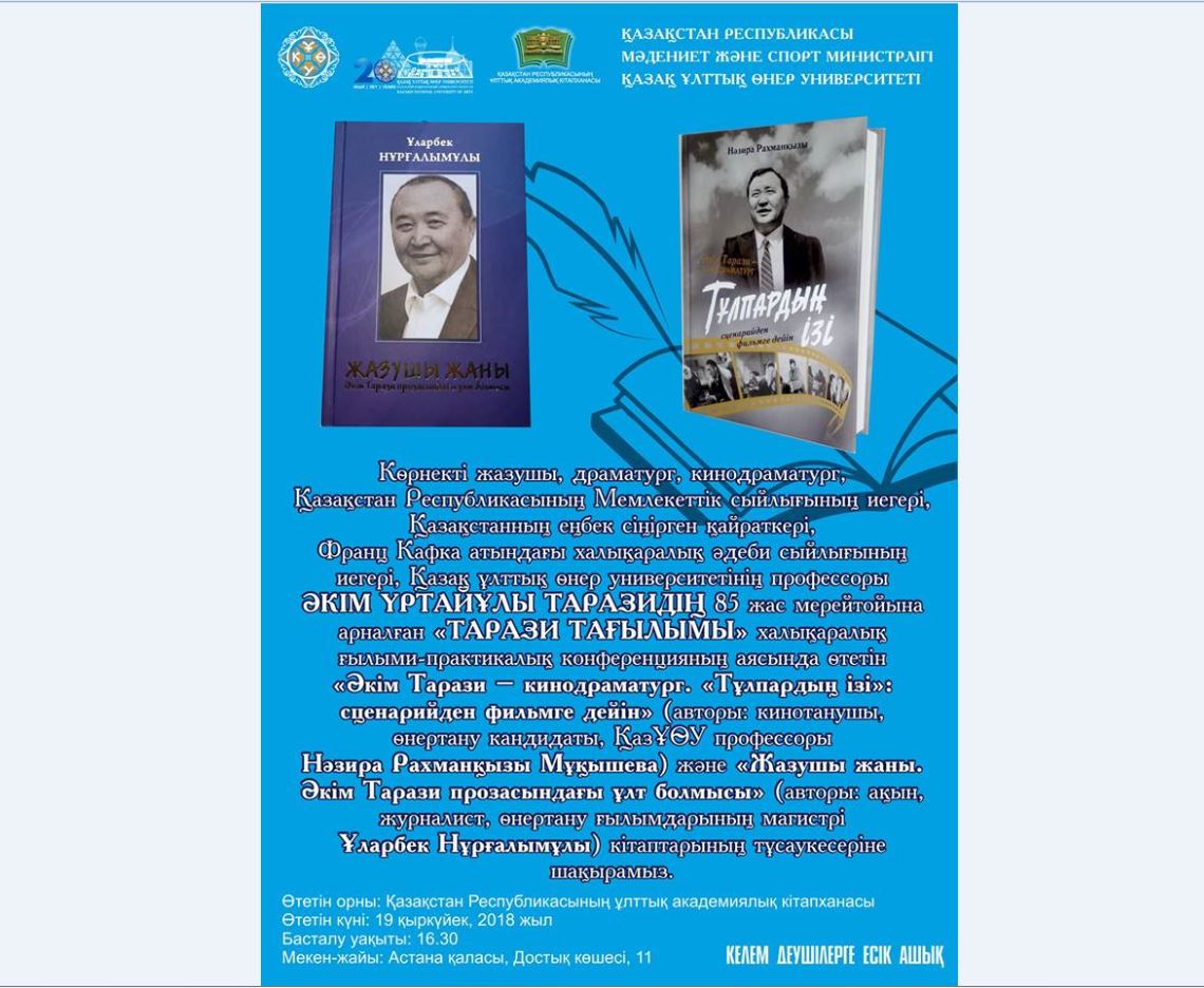Al, «JAZÝShY JANY. Ákim Tarazı prozasyndaǵy ulttyq bolmys» atty zertteý kitapqa Ákim Tarazıdyń «Tasjarǵan», «Qorqaý juldyz» romandary men 5-6 povest, áńgimelerin taldaǵan maqalalar enip otyr.