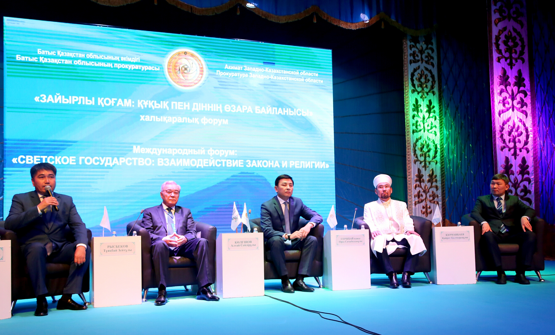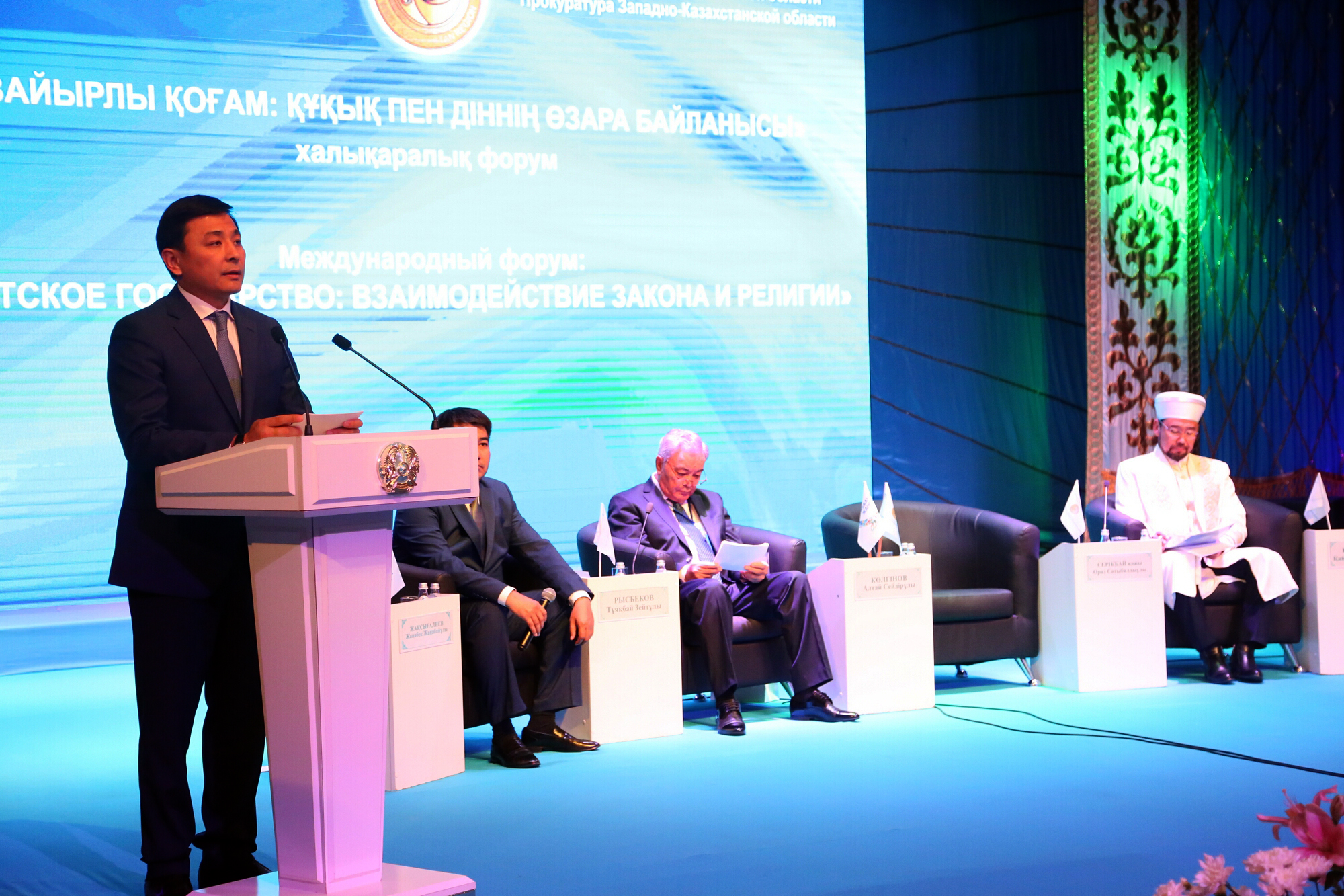 Batys Qazaqstan oblysynyń ákimi Altaı Kólginov forýmǵa qatysýshylardy quttyqtap, «Búgingi halyqaralyq forýmnyń taqyryby qoǵamdaǵy ózekti máselelerdi talqylaý jáne pikir almasýdyń shynaıy qajettiliginen týyndap otyr. Biz qazirgi tańda mádenı, rýhanı aqparattyń jáne saıası-fılosofııalyq qundylyqtardyń belsendi ózgerip jatqan kezeńinde ómir súrip kelemiz. Ýaqyttyń talabyna saı, biz de jas memleket retinde sol ózgerister men úrdisterge ýaqytyly jaýap qatyp, memlekettiligimiz ben táýelsizdigimizge kereǵar dúnıelerge der kezinde zeıin qoıýymyz zańdy. Ol úshin quqyqtyq talaptaǵy baǵyt-baǵdarymyzdy qaıta qaraýymyz da qajet bolady. Sondyqtan búgingi forým barysynda zaıyrly qoǵam, ondaǵy din men quqyqtyń ózara baılanysy, din salasyndaǵy zańnamany jetildirý tetikterin jan-jaqty talqyǵa salyp, ózara pikir almasatyn bolamyz», -dedi.