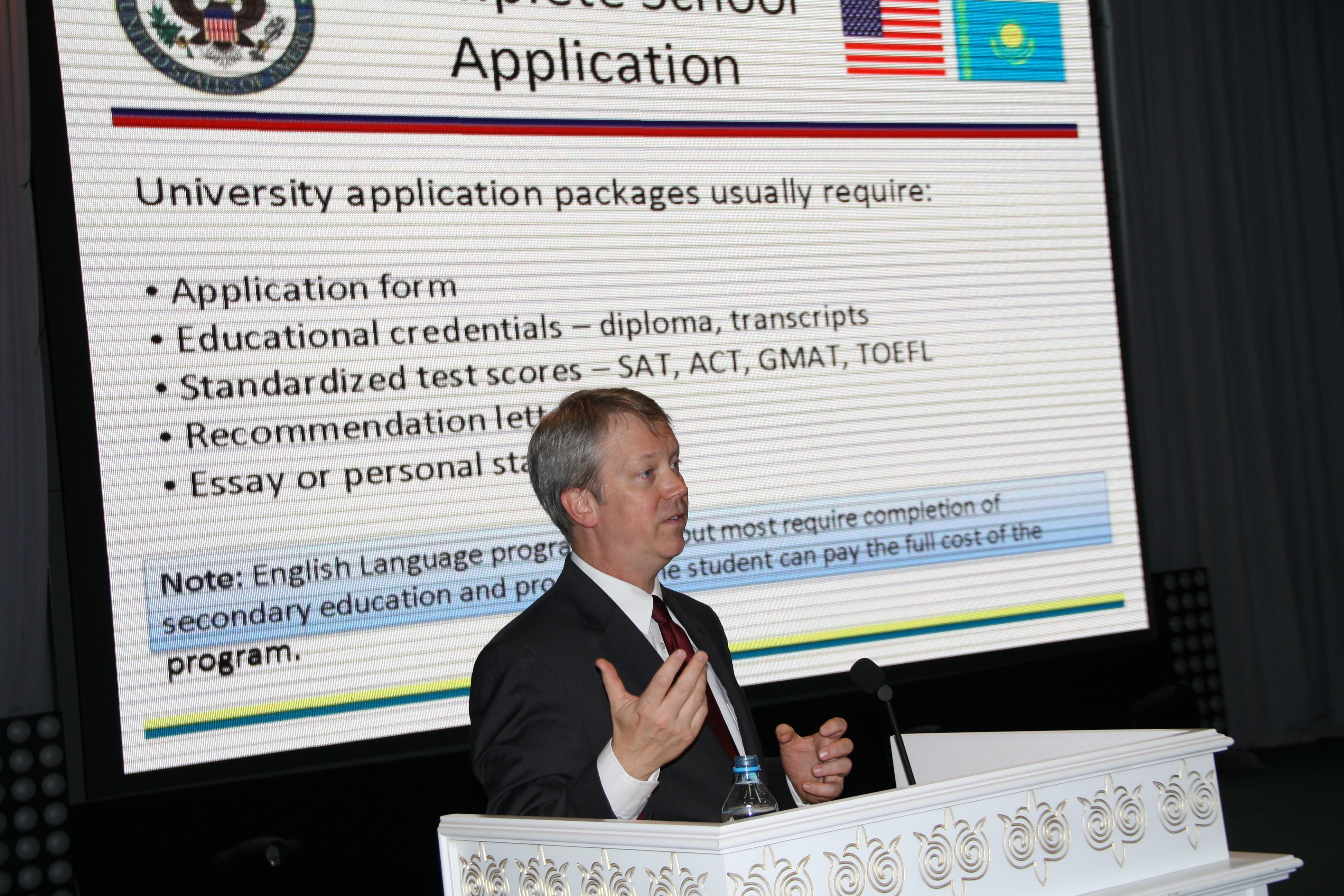Amerıkalyq bilim júıesiniń alýan túrli usynystaryn sholyp shyqqan myńdaǵan stýdentter men oqýshylar suraqtaryn emin-erkin aǵylshyn tilinde qoıyp jatyr. AQSh-tan kelgen ókilder men eriktiler (volonter) myqtap daıyndalyp kelgen eken, jarnamalyq býkletter men kádesyılaryn taratyp, meıilinshe túsindirip baqty. Kórmeden soń Lens Erıkson bastaǵan ókilder Stýdentter saraıynyń kórermender zalynda AQSh bilim júıesi, talapkerler úshin qajetti qujattar, elshilik tarapynan kórsetiletin kómek joldary týraly baıandap, suraqtarǵa jaýap berdi. Úsh tildilik saıasattyń jemisin mektep oqýshylary kórsetti. «Aǵylshyn tilin kim erkin túsinedi?» degen suraqqa kórermenderdiń basym bóligi qol kóterdi. Suraqtaryn qoıyp, tikeleı suhbattasyp otyr. «Shet tilderin bilmeý - adamnyń óz múmkindigin shekteýi» degen osyndaıda eske túsedi.