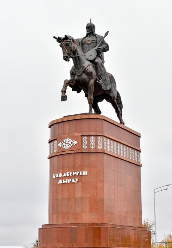 Qolyna dombyra ustap, at ústine qonǵan Qojabergen eskertkishiniń bıiktigi 12 metr. Avtory–esimi Qazaqstanǵa belgili músinshi Qazybek Satybaldın.
