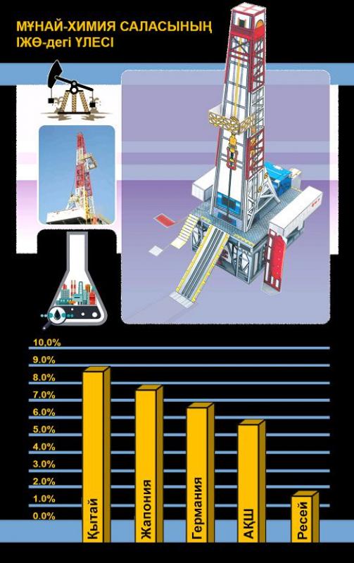 Kezinde Keńes Odaǵynyń munaı-hımııa ónerkásibiniń damý deńgeıi Japonııa, Germanııa elderimen birdeı bolǵanymen, odaq qulaǵannan keıin kúrt quldyrap ketti. Qazir Qytaıda bul salanyń IJО́-degi úlesi 8,9 paıyz eken. Osy kórsetkish Japonııada – 8,2, Germanııada – 6,9, AQSh-ta 6,1 paıyzdy quraıdy. Biz 2017 jyldaǵy derekterdi tilge tıek etip otyrmyz. Al qurylys, densaýlyq saqtaý sııaqty munaı-hımııamen tyǵyz baılanysty salalardyń úlesin qosa eseptesek, damyǵan elderde ol IJО́-niń tórtten bir bóligi shamasynda eken.