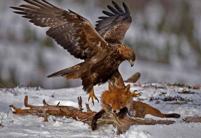 О́z qyranynyń symǵa soǵylyp, basqa túlkige túskenin ańdamaı qalǵan búrkitshi keıingi shúılikken qyrandy ajyratyp alyp jatyp: