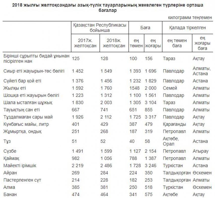 2018 jylǵy jeltoqsanda kókónisterden kartopqa ortasha baǵa kılogramyna 86 teńgeni (2017 jylǵy jeltoqsanda – 117 teńge), aq qaýandy qyryqqabatqa – 101 teńgeni (78 teńge), basty pııazǵa – 77 teńgeni (94 teńge), sábizge 98 teńgeni (116 teńge) qurady.