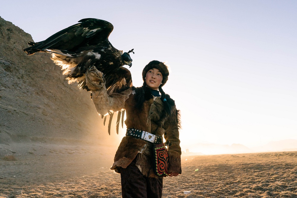 Baıan-О́lgeı, Mońǵolııa - Juma kúni sabaq bitken soń, Zamanbol úıine oralyp, úı jumysyn oryndap jáne jasóspirimderge tán úı jaǵdaıyndaǵy óz mindetterin atqarady. Al senbide ol atyn erttep, óziniń úıretilgen jyrtqysh qusymen qar taýlaryna baǵyt alyp, senimdi áriptesimen jabaıy ańdardy aýlaýǵa bet alady.