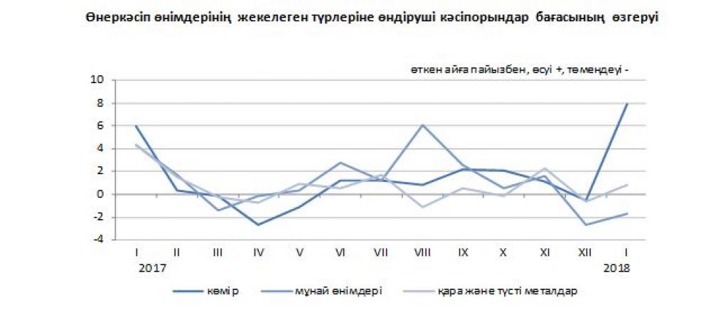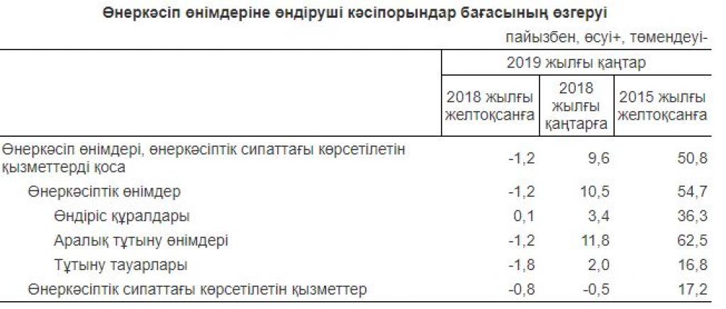 О́tken aıda óndirýshi kásiporyndar baǵasy benzınge, suıytylǵan propan jáne býtanǵa 5%-dan, munaıǵa - 2,9%, mazýtqa 1,4%-ǵa tómendedi, kómirge - 7,9%, tabıǵı gazǵa - 1,5%, metall kenderine 0,5%-ǵa joǵarylady.